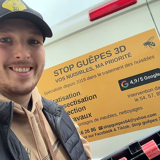 Basée à Dombasle et crée en 2019, Stop Guêpes 3D est spécialisée dans la destruction de nids de guêpes, frelons, dératisation et autres nuisibles volants et rampants Depuis sa création, l’entreprise connaît une croissance continue, portée par la qualité de ses interventions, sa réactivité et son professionnalisme.